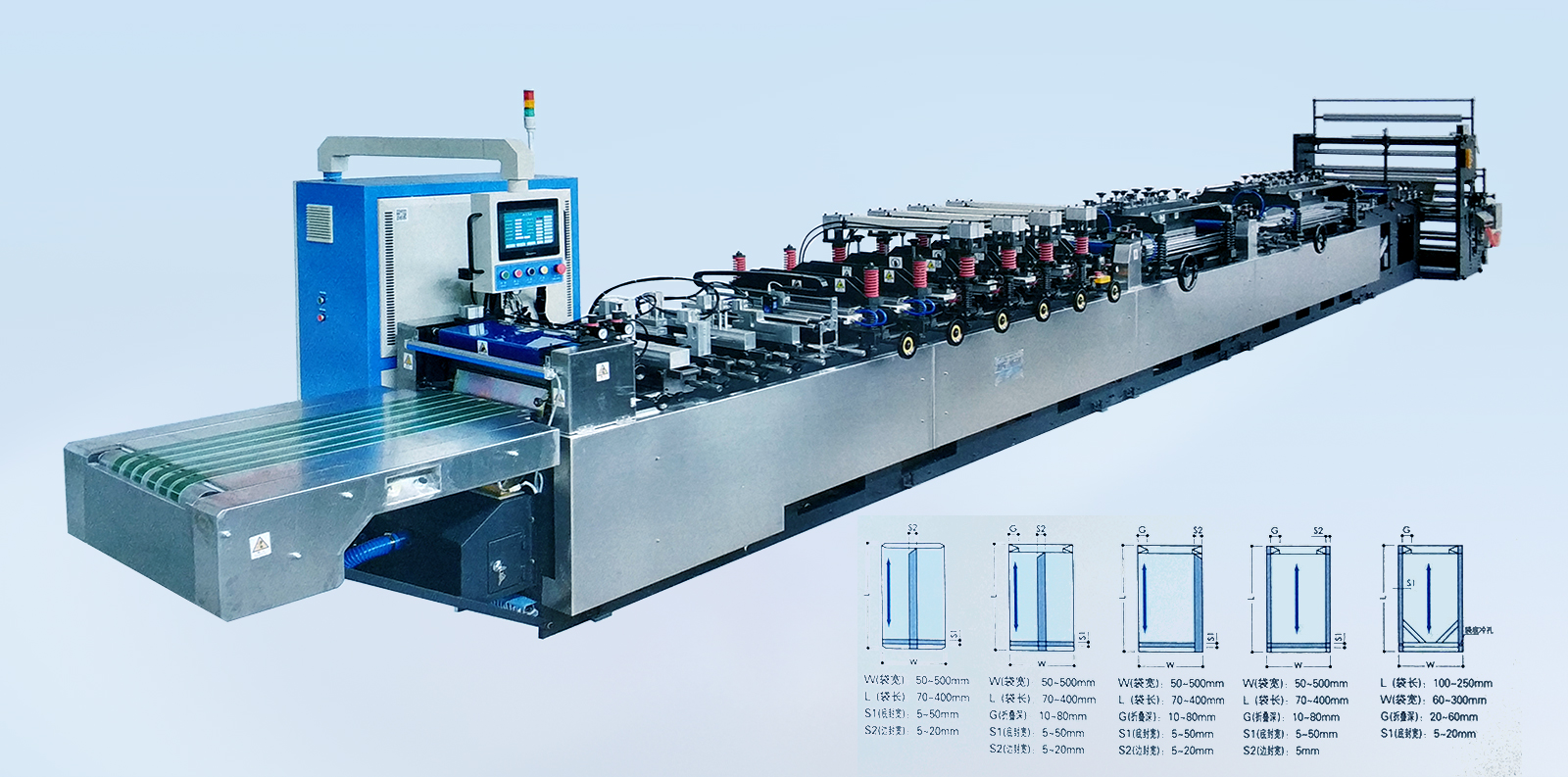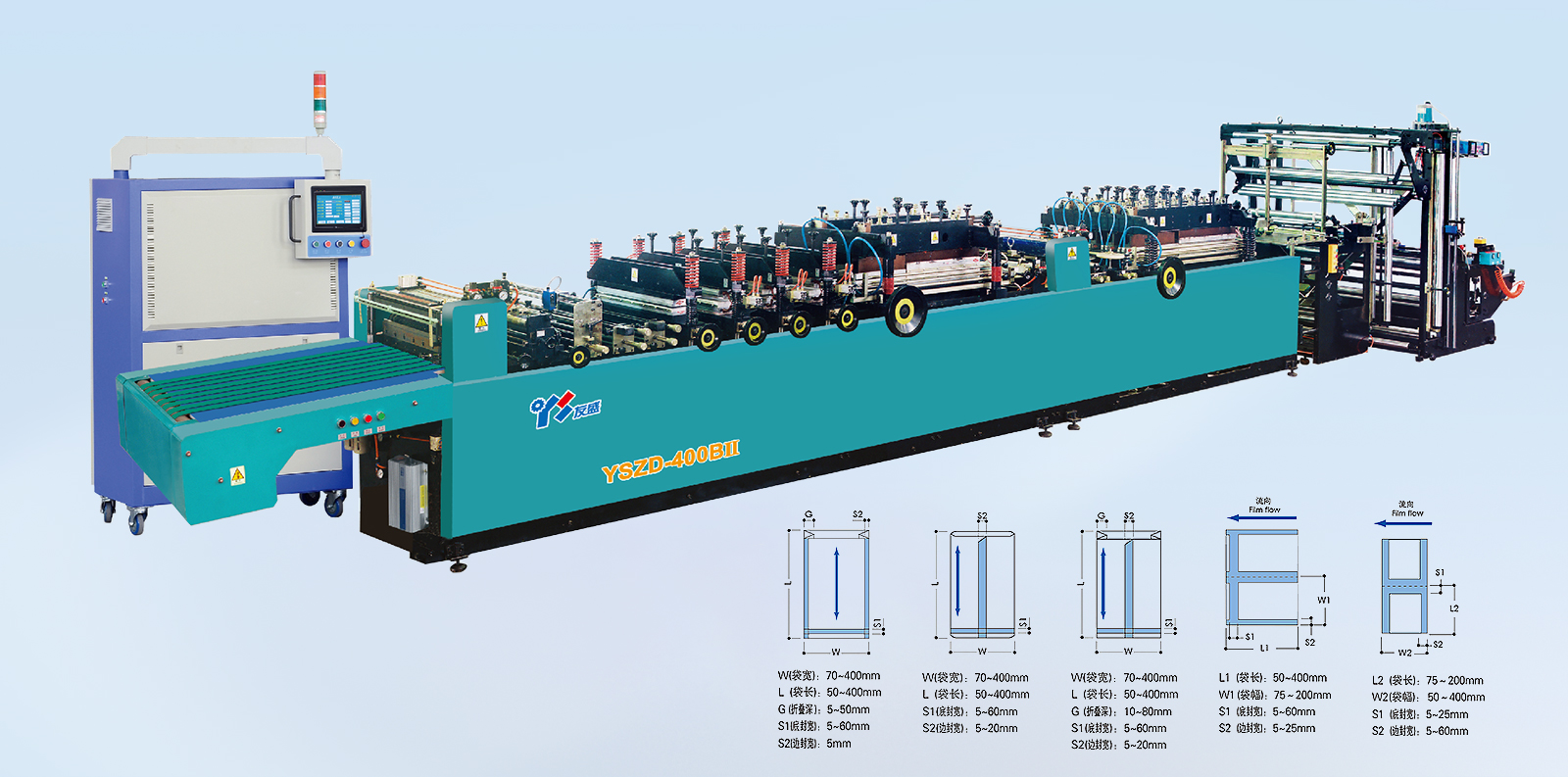 YSZD-400B Ⅱ中封、三邊封、四邊封高速全自動(dòng)制袋機(jī) YSZD-300/400/500ZF中封、側(cè)封、四邊封高速全自動(dòng)制袋機(jī) YSZD-500ZF中封、側(cè)封、四邊封高速全自動(dòng)制袋機(jī) YSZD-500/600/700/800/1000H三邊封高速全自動(dòng)制袋機(jī) YSZD-600C無(wú)接縫站立袋三邊封、站立袋高速全自動(dòng)制袋機(jī) YSZD-500HK三邊封、站立袋、拉鏈袋、無(wú)接縫站立拉鏈袋、儲(chǔ)料架高速全自動(dòng)制袋機(jī) YSZD-600HB三邊封、站立袋、拉鏈袋高速全自動(dòng)制袋機(jī) YSZD-600HK三邊封、站立袋、拉鏈袋、無(wú)接縫站立拉鏈袋高速全自動(dòng)制袋機(jī) YSZD-600HK Ⅰ上下圖案跟蹤三邊封、站立袋、拉鏈袋、無(wú)接縫站立拉鏈袋高速全自動(dòng)制袋機(jī) YSZD-600HK Ⅱ CCD視覺(jué)定位裁切三邊封、站立袋、拉鏈袋、無(wú)接縫站立拉鏈袋高速全自動(dòng)制袋機(jī) YSZD-800HK三邊封、站立袋、拉鏈袋、無(wú)接縫站立拉鏈袋高速全自動(dòng)制袋機(jī)